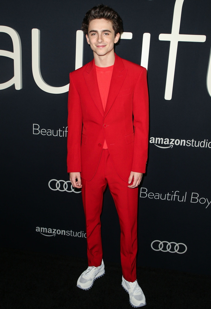 Jamie Lee Curtis e Timothée Chalamet simplesmente não podiam passar despercebidos com seus ternos em vermelho-escarlate, usados com camiseta