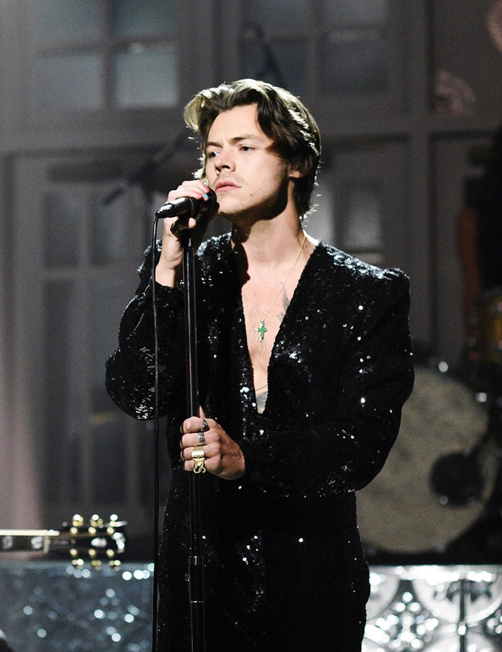 Courteney Cox usou uma blusa preta transparente e calças pretas, e Harry Styles vestiu um macacão preto com uma blusa transparente, acrescentando um brinco de pérola para incrementar o visual