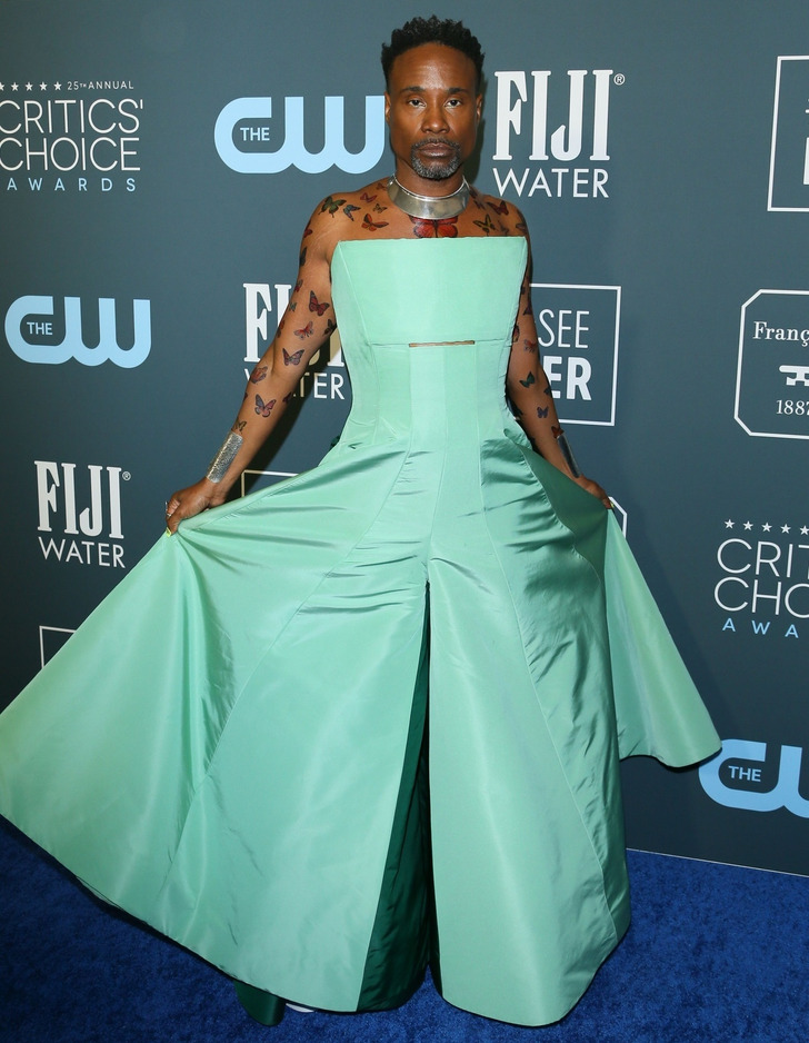 Para eventos de tapete vermelho, Jennifer Lawrence e Billy Porter escolheram roupas com a parte de cima quadrada. Jennifer usou um vestido longo preto com ombros à mostra, enquanto Billy escolheu um macacão verde sem alças em dois tons