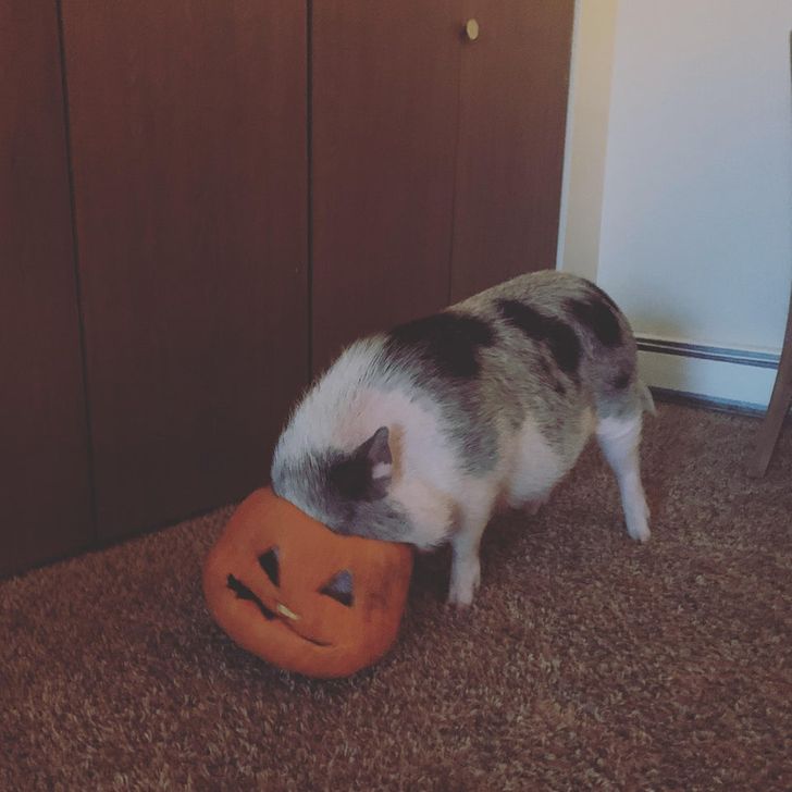 “Estamos provando algumas fantasias. ALGUÉM esculpiu o lado errado da abóbora. Ainda bem que ela pode se virar com isso”