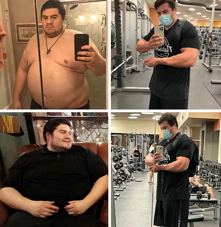 “À esquerda estou com 210 kg (47% de gordura corporal), à direita, 142 kg (17% de gordura corporal)”
