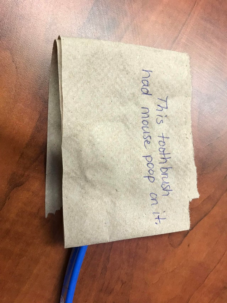 13. “A empresa onde trabalho contratou um serviço de limpeza por causa de reclamações sobre ratos. Hoje, encontrei este recado na minha escova de dentes que uso diariamente”