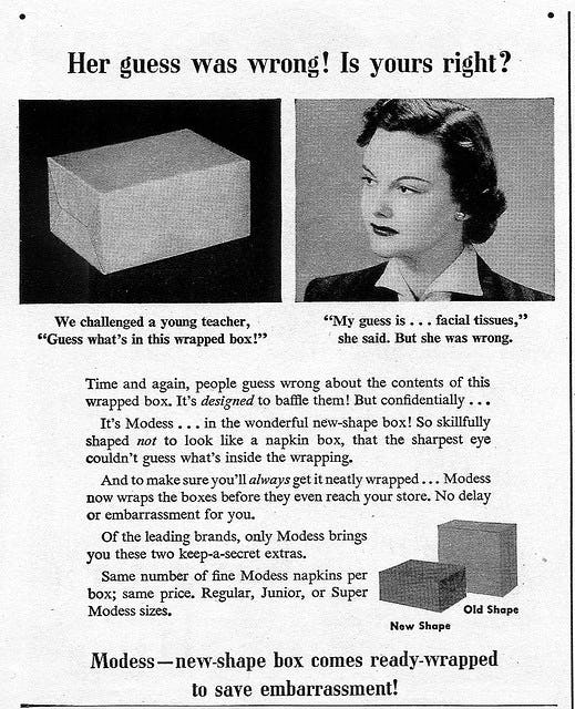 Na década de 1950, nas propagandas dos absorventes da Modess, uma marca da Johnson & Johnson, eram ilustradas mulheres de vestidos de gala. O produto em si não era exibido, e o slogan publicitário era difícil de decifrar: “Modess... because” (“Modess... porque”, em tradução livre). Os absorventes eram vendidos em pacotes sem informações sobre o produto, fazendo com que fosse impossível adivinhar o conteúdo. Naquela época, observava-se a relutância de tratar abertamente da menstruação, que era considerada um tabu. A campanha durou até os anos 1970.