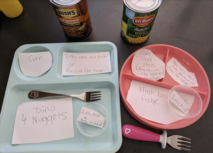 No prato rosa: “milho e ervilha (na panela a vapor verde); esquentar o arroz que sobrou; almôndega na geladeira; ketchup”.