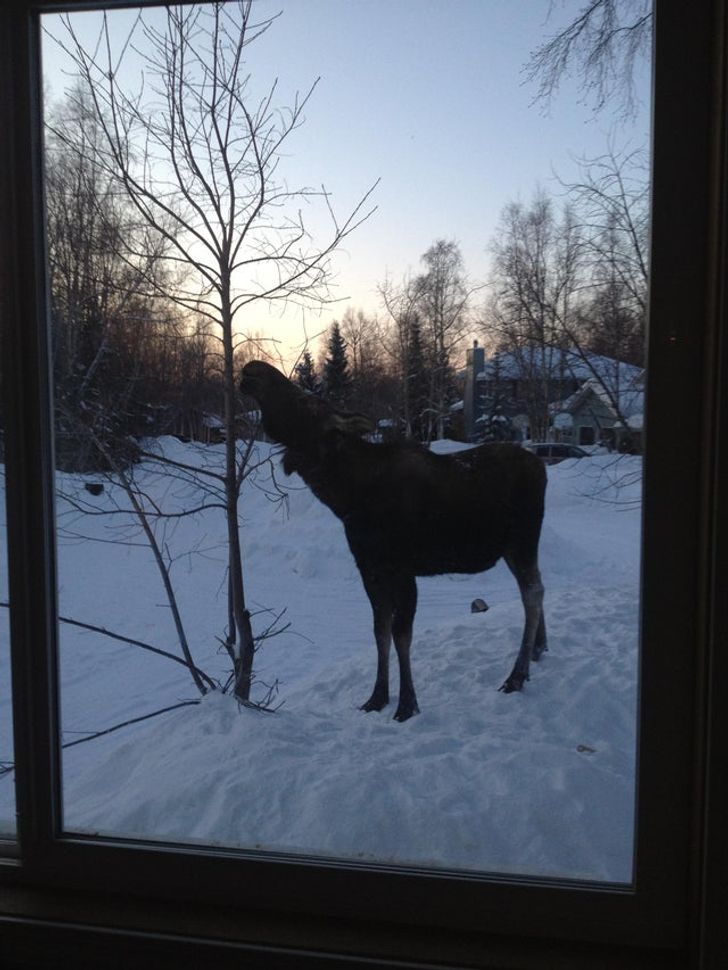 “Este alce está comendo o topo da árvore do lado de fora da janela do nosso cômodo no segundo andar”