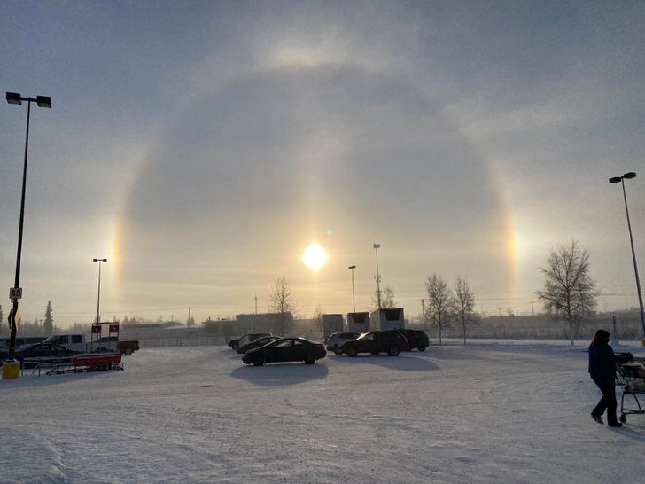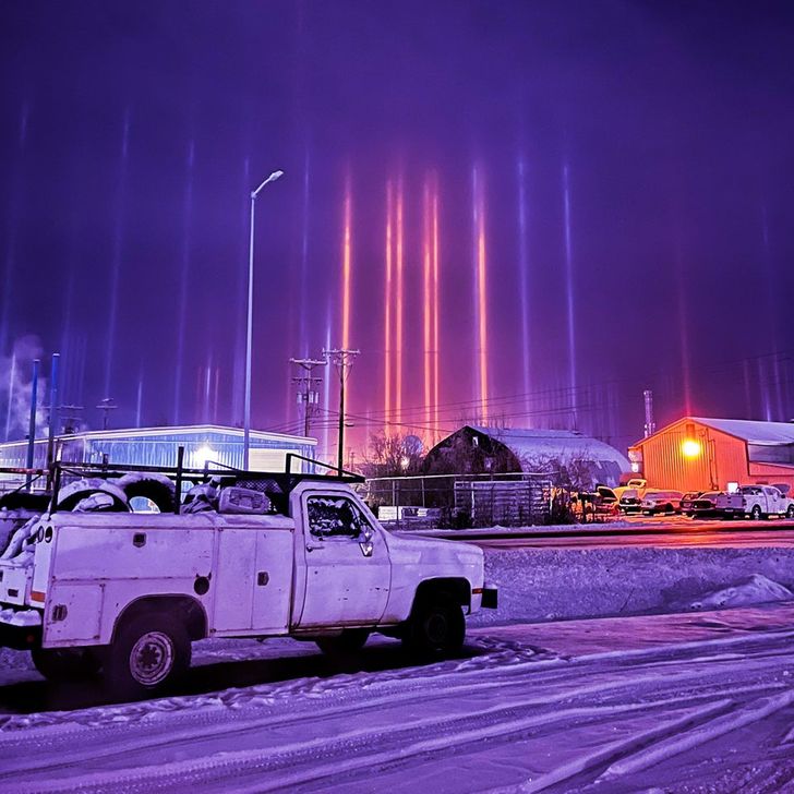 Estes pilares de luz no Alasca surgem graças ao reflexo da luz nas bordas dos cristais de gelo que flutuam no ar