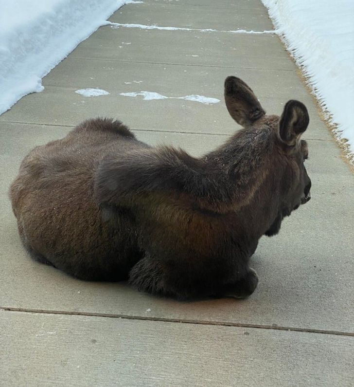 Aqui, os animais desfrutam de todos os avanços da humanidade. Por exemplo, um alce local relaxando na calçada aquecida