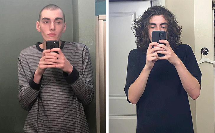“Para aqueles que perguntaram como o meu cabelo aparentava antes de eu deixá-lo crescer”