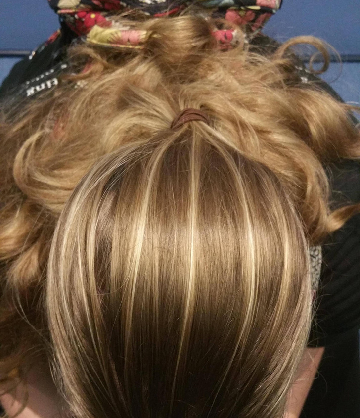 “O espaço entre as mechas loiras naturais da minha esposa”