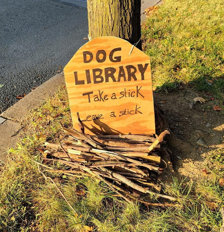 “Biblioteca de cachorros. Pegue um graveto. Deixe um graveto”