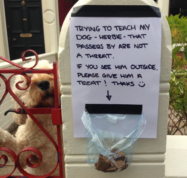 “Estou tentando ensinar ao meu cachorro, Herbie, que os transeuntes não são ameaças. Caso o veja do lado de fora, por favor, dê um petisco a ele. Obrigado!”