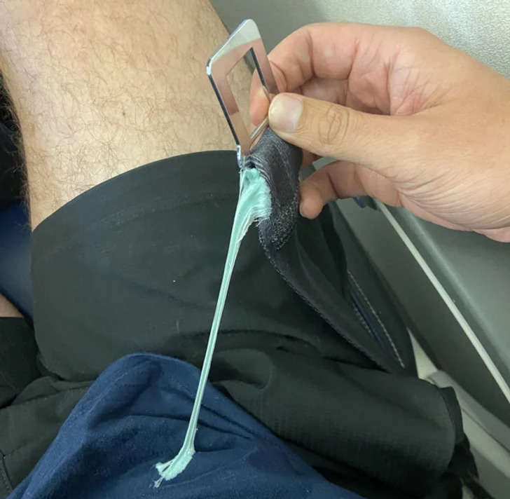 Este infeliz momento foi graças a algum mal-intencionado. A pessoa da foto não hesitou em mandar um cumprimento: “Um grande cumprimento à pessoa que colocou seu chiclete na fivela do cinto de segurança antes do meu voo!”