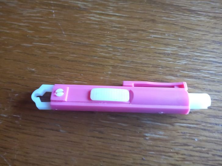 17. “Encontrei isto em uma antiga máquina de costura: feito de plástico, quando se aperta o botão, sai uma espécie de pinça. O que é e para que serve?”