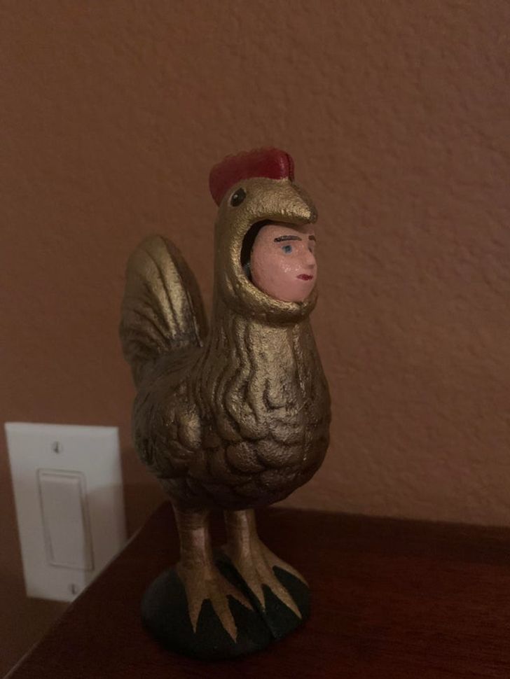 2. “Este objeto ficou olhando para mim na loja por três anos até que eu o comprei. A figura é conhecida como ’Homem Galinha’”