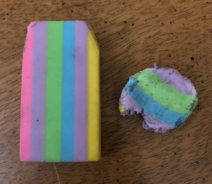 13. “A borracha que usei do ensino fundamental ao médio, em comparação com uma nova”