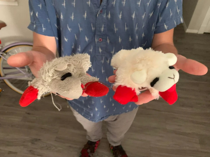 12. “Carneirinho de brinquedo do meu cachorro. Um com 2 anos de uso e o outro, novinho”