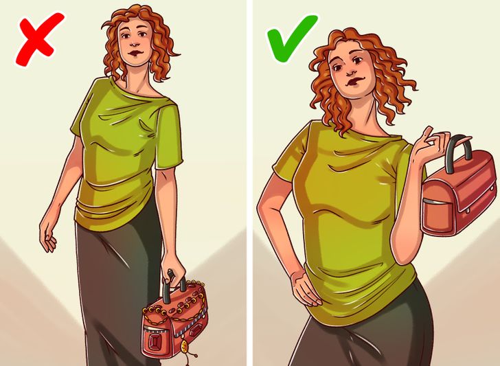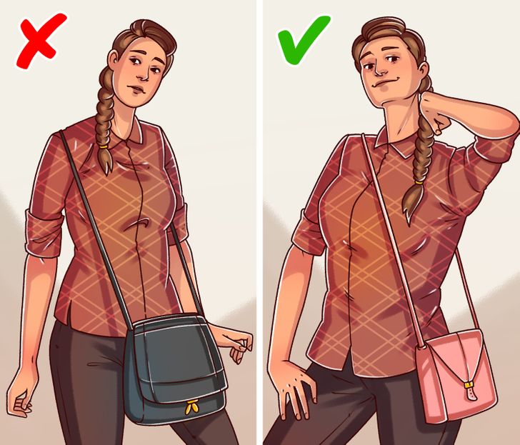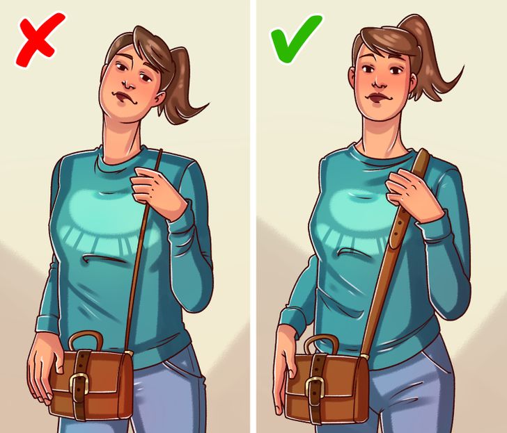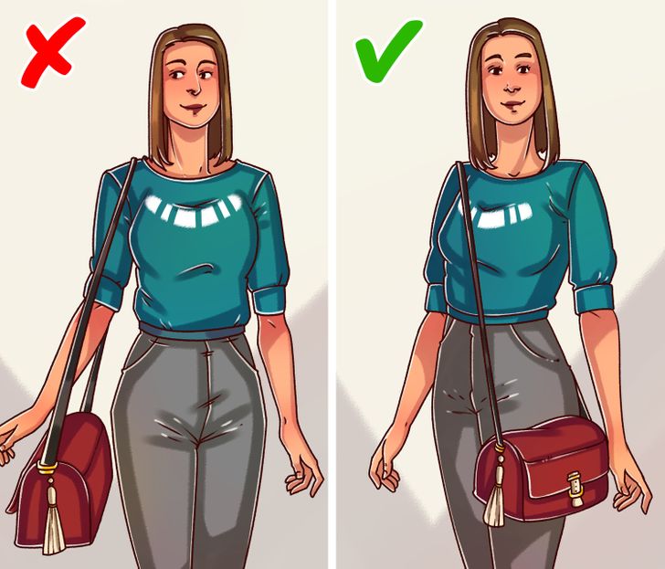 Quando você escolhe uma bolsa que fica próxima do corpo, o peso do acessório será distribuído de maneira uniforme e mais ergonômica. Use a peça como uma espécie de “crossbody”: se a alça for colocada no ombro direito, coloque o “corpo” da bolsa no lado esquerdo. E lembre-se de que é recomendável mudar de lado de vez em quando.