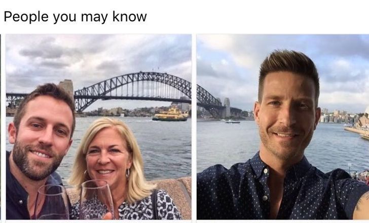 18. “Estas 2 pessoas, que não são parentes, apareceram na minha seção ’sugestões de amizade’, do Facebook, e suas fotos de perfil se alinham perfeitamente, formando a ponte da Baía de Sidney, na Austrália”