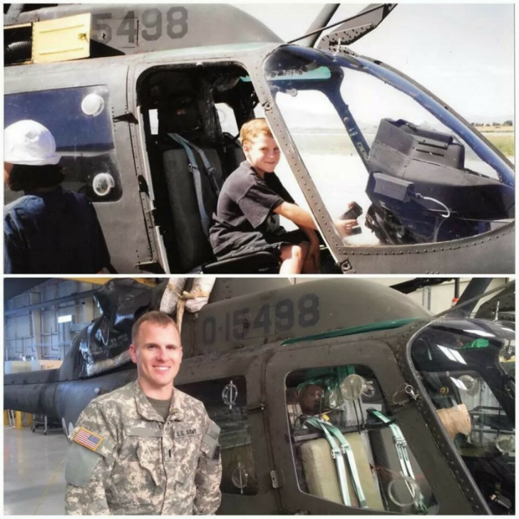 Há 20 anos, fui a um espetáculo aéreo com meu avô e meu tio. Um dos helicópteros que visitei foi um OH58 Kiowa. Esse foi o dia em que decidi que queria ser piloto. Hoje, enquanto olhava algumas fotos antigas, encontrei uma imagem minha com o helicóptero.