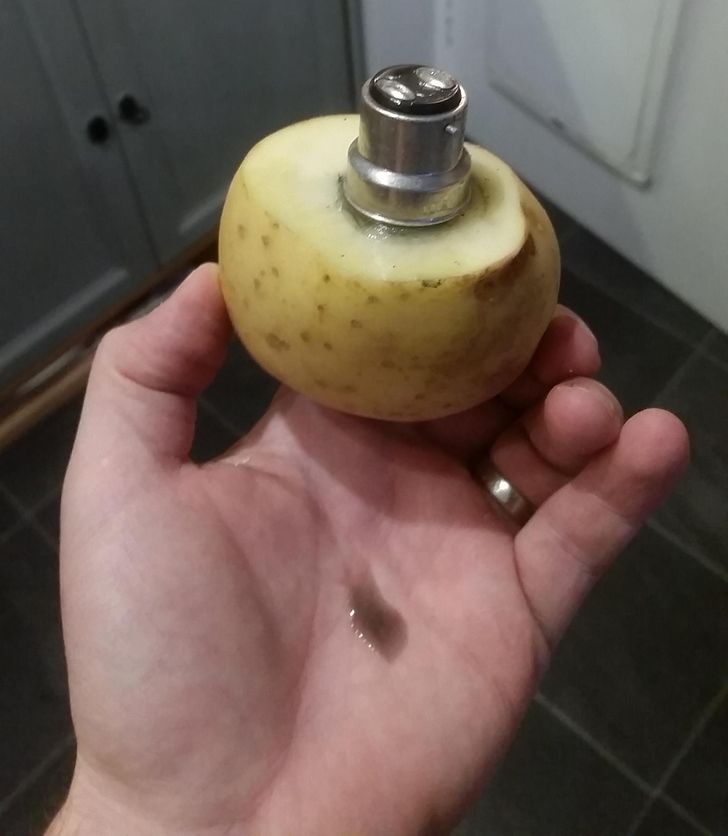 Se a lâmpada quebrar enquanto estiver tentando trocá-la, não há necessidade de entrar em pânico. Antes de tomar outras medidas, coloque luvas de proteção e verifique se a luz está apagada. Arredonde o extremo de uma batata com uma faca e insira-o na ponta do que seria a lâmpada. Depois, gire-a no sentido anti-horário até que o vidro quebrado seja inserido na batata.