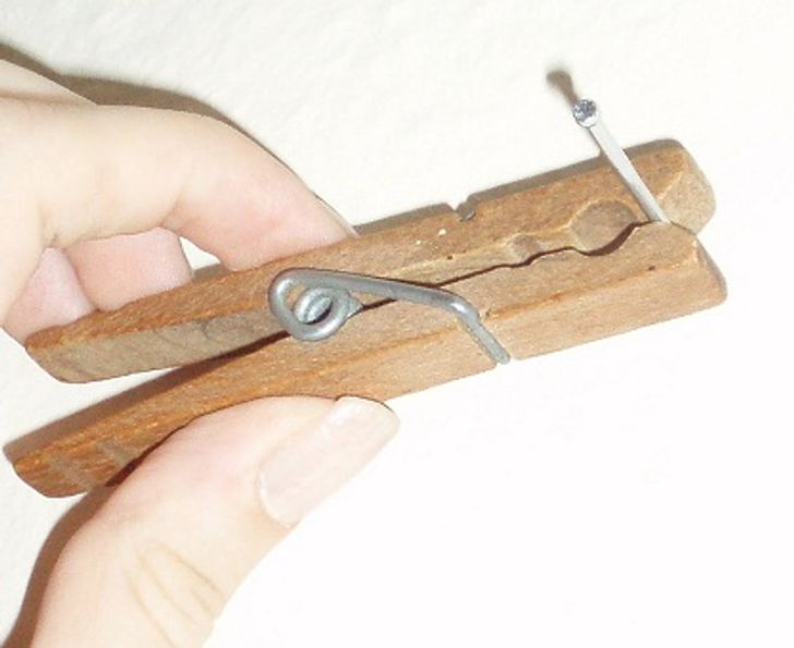 Para proteger os dedos, basta segurar o prego com um prendedor de roupa, prendê-lo no lugar e sua ponta será projetada do lado que está contra a superfície. Esta é uma ótima maneira de manter seus dedos intactos!
