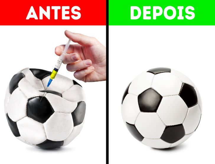 Se o interior da câmara de borracha da bola tiver um pequeno orifício, ele pode ser facilmente reparado com a ajuda de uma clara de ovo, uma seringa e uma bomba com agulha. Encha a seringa com clara de ovo e insira-a na bola através da bomba com a agulha conectada à seringa, gire a bola para garantir uma distribuição uniforme. Deixe a bola secar por 12 a 24 horas.