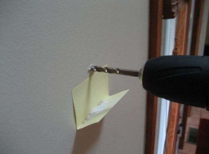 Ao perfurar paredes de gesso, dobre uma nota adesiva e cole-a sob a broca. A nota pega o pó e, quando o serviço estiver pronto, tudo o que você precisa fazer é tirá-la da parede e jogá-la fora, evitando encher o chão de pó.