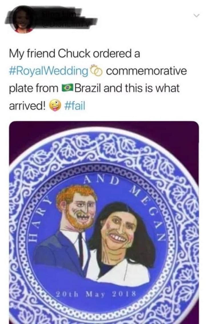 Meu amigo Chuck encomendou do Brasil um prato comemorativo pelo casamento real e foi isso que ele recebeu...