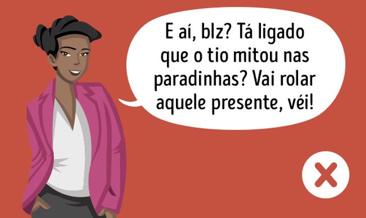 - Já que falamos em gírias no parágrafo anterior, voltemos a elas. Se não for muito íntimo de seu interlocutor, evite-as a qualquer custo. Gírias, em geral, são parte do vocabulário específico de um determinado grupo. Então, se a pessoa com quem estiver falando não fizer parte desse grupo, terá de ’ligar uma tecla SAP interna’ e traduzir mentalmente todas as expressões. E isso, evidentemente, dificulta a comunicação.