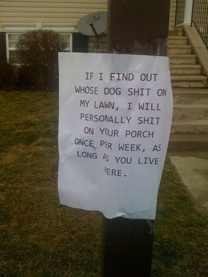 "Se eu descobrir qual o cachorro que fez cocô no meu quintal, vou fazer isso pessoalmente uma vez por semana na sua porta enquanto você morar aqui."
