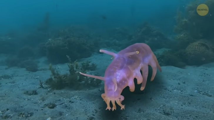 Agora vamos para as criaturas misteriosas que habitam esse lugar, já que milhares de espécies de vida selvagem vivem apenas aqui e em nenhum outro lugar do mundo. Vamos começar com o peculiar porco-do-mar, ou um dos pepinos-do-mar, como às vezes é chamado. Há muitos deles nas águas da Antártida. Mas por que ele é chamado assim? Por causa da sua tonalidade rosa e aparência redonda e inchada. Olhando mais de perto, ele parece até ter uma pequena cauda e um conjunto de orelhas. Assim como um porco! Eles ajudam muito na qualidade das águas aqui, filtrando areia e sedimentos.