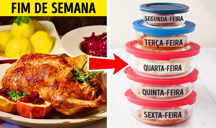 Pratos de cozimento longo, como peru ou carne de porco, exigem muito tempo e são adequados para preparar num fim de semana em família. Mas suas sobras serão úteis durante a semana: guarde-os em recipientes bem fechados e use-os como ingredientes para sanduíches, saladas ou lanches.