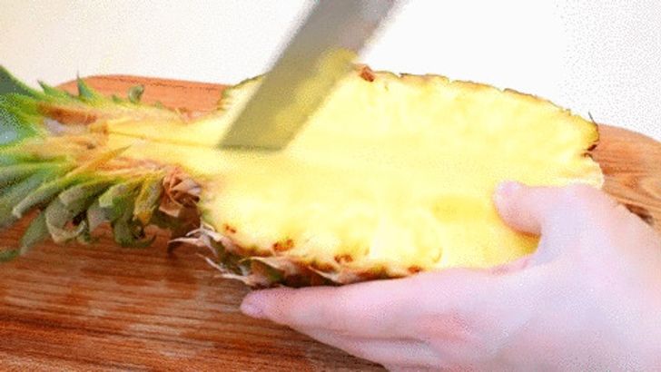 Com uma faca afiada, corte o abacaxi em 4 partes e depois recorte a polpa de cada uma.