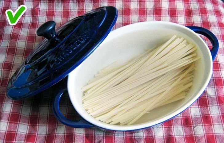 Pode parecer estranho, mas funciona! Coloque o macarrão de molho na água, em um recipiente hermético, e deixe descansar por algumas horas ou durante a noite. Então, você pode rapidamente cozinhá-lo em água fervente ou simplesmente colocá-lo em uma panela com molho quente.