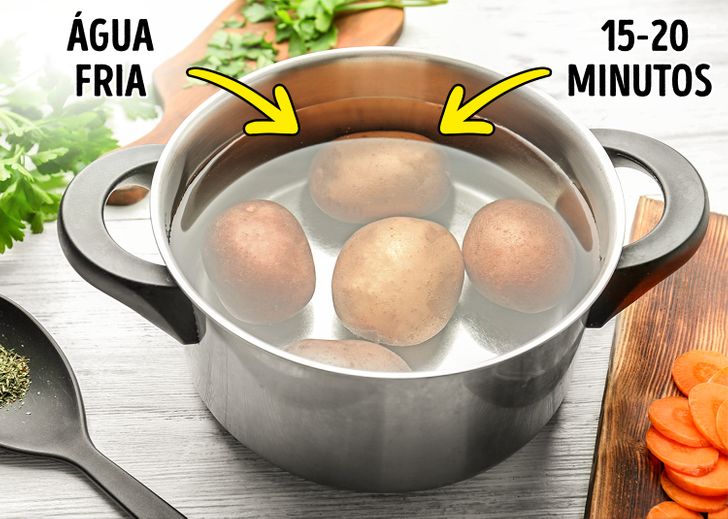 Coloque as batatas lavadas em uma tigela de água fervente por 30 segundos. Depois, passe-as para outra com água fria. Após mais 30 segundos, será possível remover a pele com os dedos: ela vai sair por causa da mudança súbita de temperatura. Ou você também pode simplesmente deixá-las por 15 a 20 minutos em água com sal.